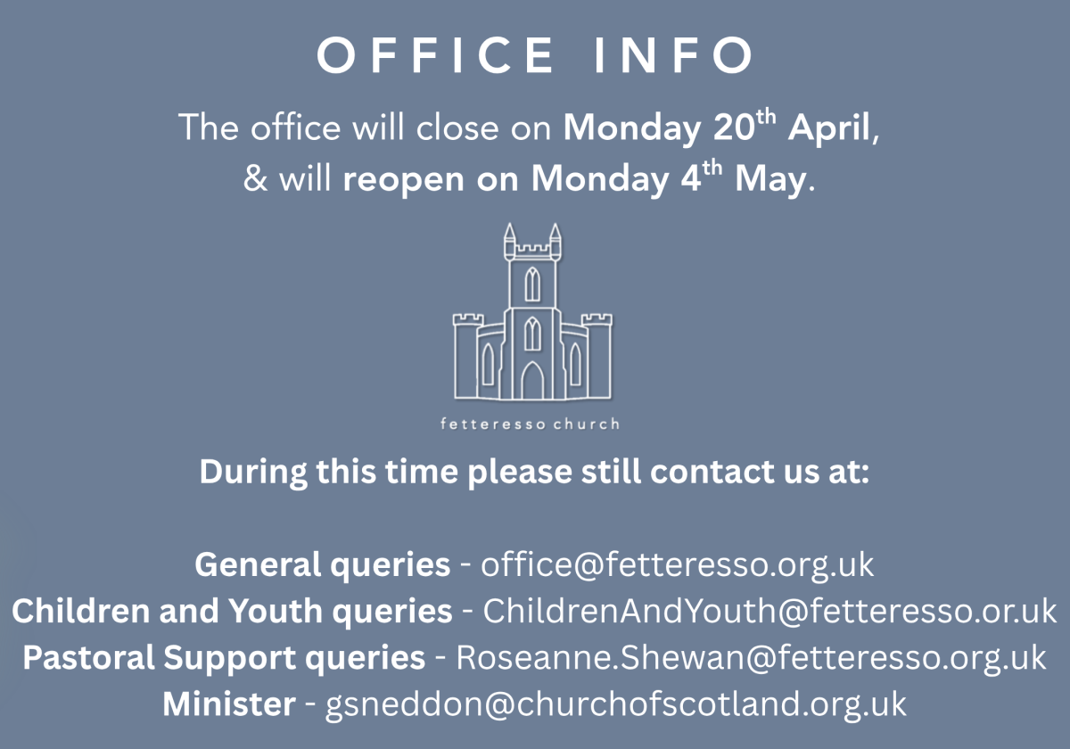 Church office is closed from Monday 27th April - Monday 4th May. Emails will still be monitored during this closure.